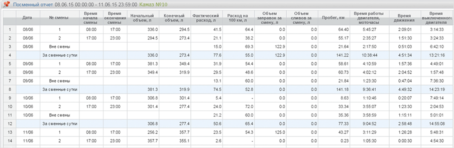 посменный отчет, включающий время движения ТС и расхорд топлива